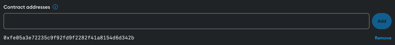 To allow a specific Ethereum address, input it into the Contract Addresses field and select Add. In the following example we'll use 0xfe05a3e72235c9f92fd9f2282f41a8154d6d342b.