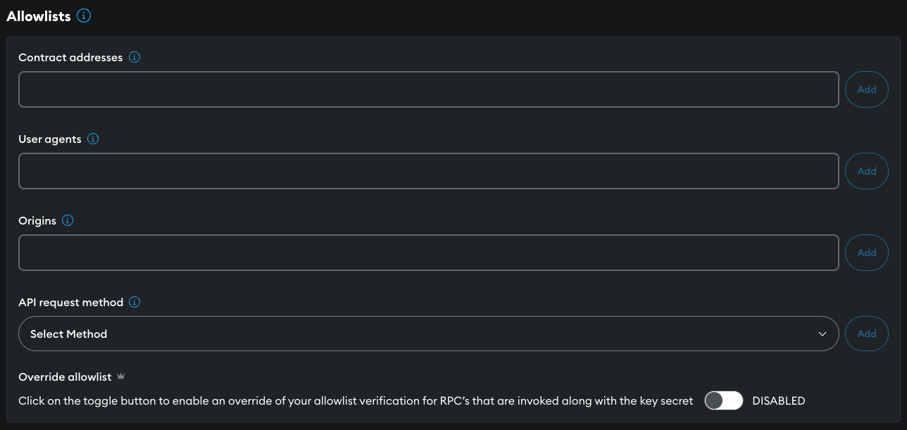• Principle of least privilege on the client side - On the client side of your dapp, you may wish to limit the actions possible with your API key to only those necessary for the application's functionality. Allowlists ensure the API key is used solely for authorized locations, smart contract addresses, or methods.
